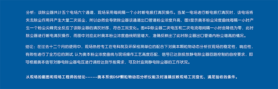分析:在发电机组负荷增大时,管道内粉尘含量应该随之增大,而图中显示奥本粉尘浓度变化曲线与机组负荷变化曲线相符,很好的反映了现场的工艺状况。