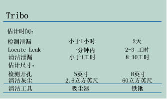 Tribo.trac检漏仪使维护小组只须检查300个集尘袋,而非3600个集尘袋,将泄漏定位时间缩短为几分钟。而光学设备两天内都未检测出泄漏,直到破损的直径从1/4英寸扩大为8英寸时,才发现泄漏。到这时,集尘袋泄漏的灰尘量已超过60立方英尺,清洁需10个工时,相比之下,在Auburn的系统发现破损时,积聚的灰尘只有2.6立方英尺。